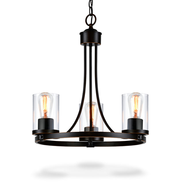 QPlus 3 Light Rustic Round Chandelier Pendant Lamp with E26 Bulb base & Clear Glass Shades - Black / Bronze